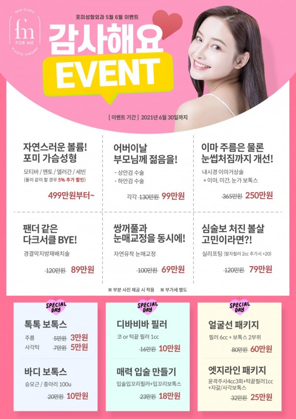 5~6월 이벤트 1 페이지 정보 작성자 포미성형외과 작성일21-05-04 17:48 조회2,851회 관련링크 이전글 다음글 목록 답변 본문 5~6월 이벤트입니다 이전글 다음글 목록 답변