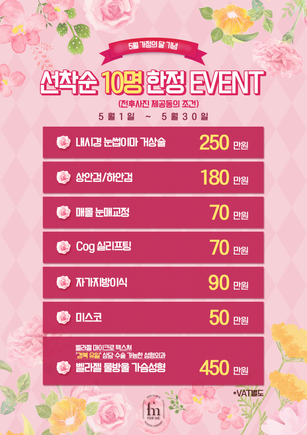 5월 가정의달 선착순 10명 한정 이벤트! 페이지 정보 작성자 포미성형외과 작성일18-05-03 17:34 조회1,923회 관련링크 이전글 다음글 목록 답변 본문 - 이전글 다음글 목록 답변